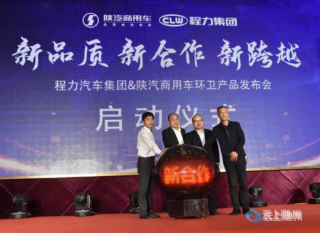 程力汽车集团党委副书记、集团公司常务副总经经理、程力(湖北)底盘供销公司董事长程国强,陕汽商用车销售公司副总经理魏宇龙,程力集团副总经理、底盘供销公司总经理刘峰,陕汽商用车销售公司专用车部部长穆玮周共同启动水晶球,宣布程力集团陕汽商用车环卫系列产品正式发布。