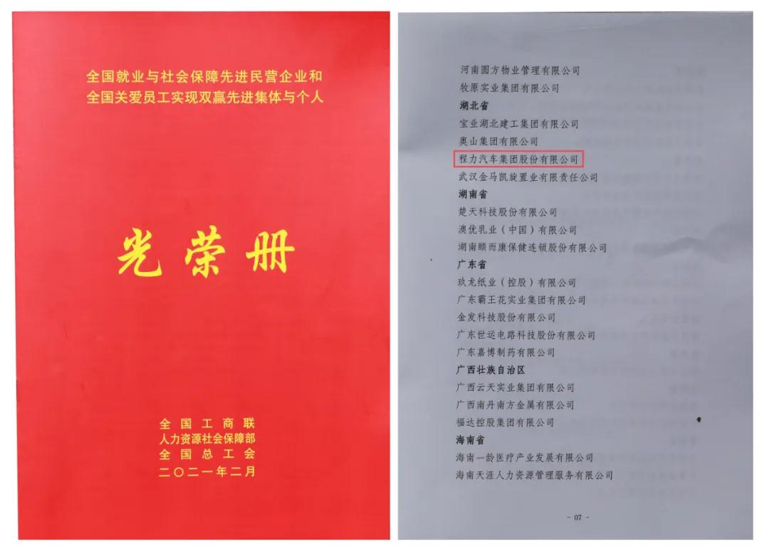 3月2日,程力汽车集团股份有限公司收到国家人力资源和社会保障部、中华全国工商业联合会、中华全国总工会联合颁发的“全国就业与社会保障先进民营企业”荣誉证书及牌匾,这是程力汽车集团股份有限公司在2021年初被授予的开门红全国性殊荣,也是程力集团继2020年连续三次受到全国性荣誉表彰。