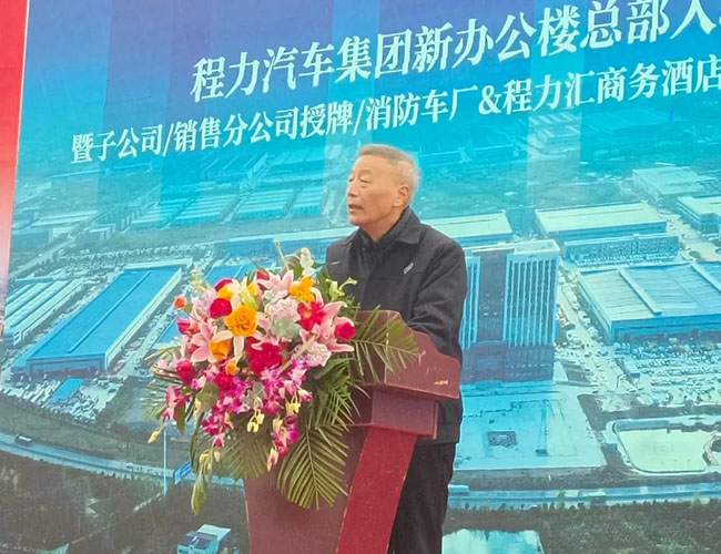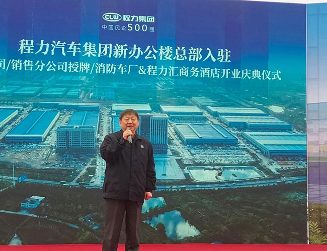 在程力集团新厂办公大楼总部入驻庆典会上,集团总经理程阿罗为程力消防车公司总经理汪东洋,举行了消防器材厂开业授牌仪式,汪东洋总经理作了表态和发言。