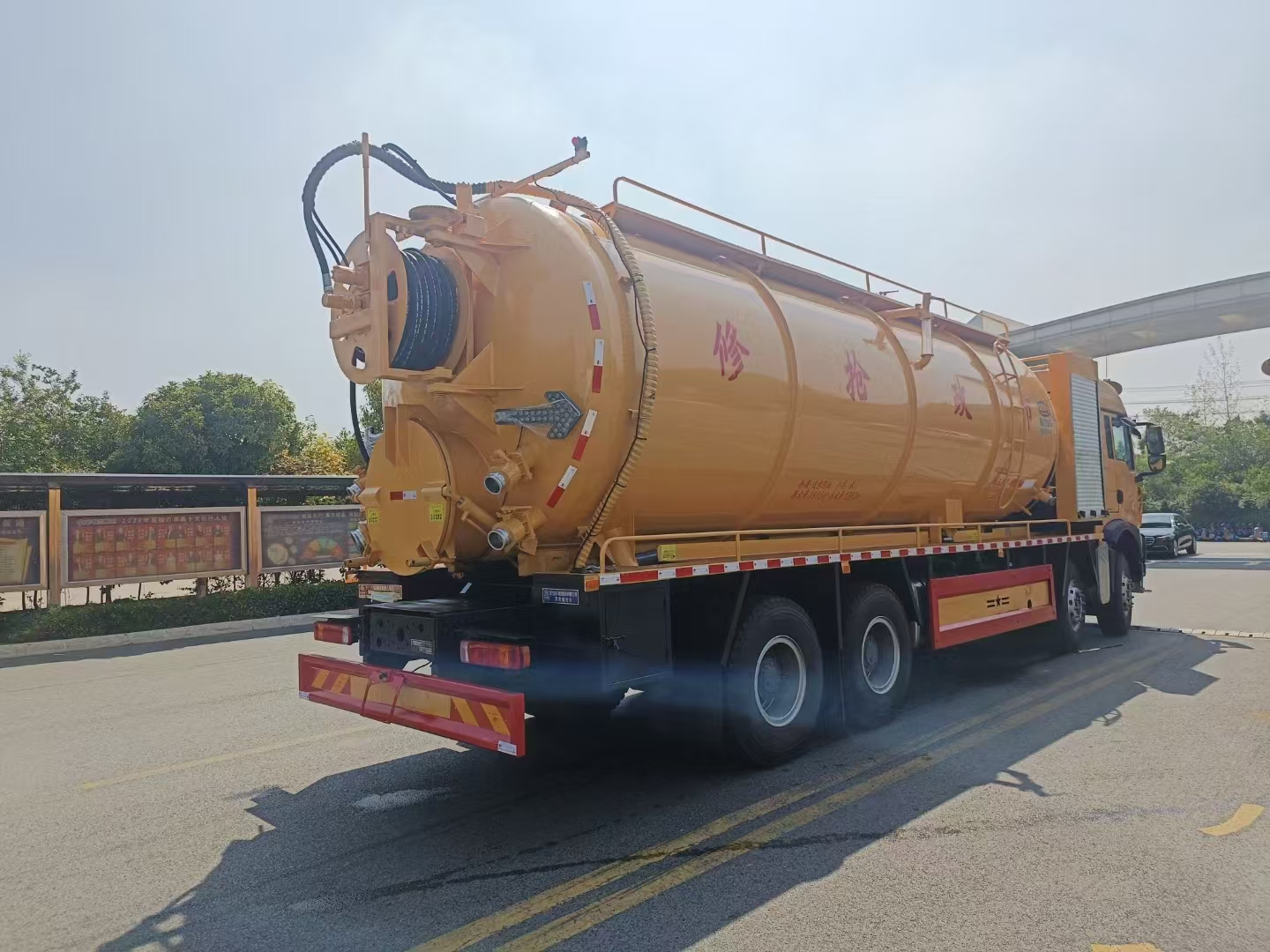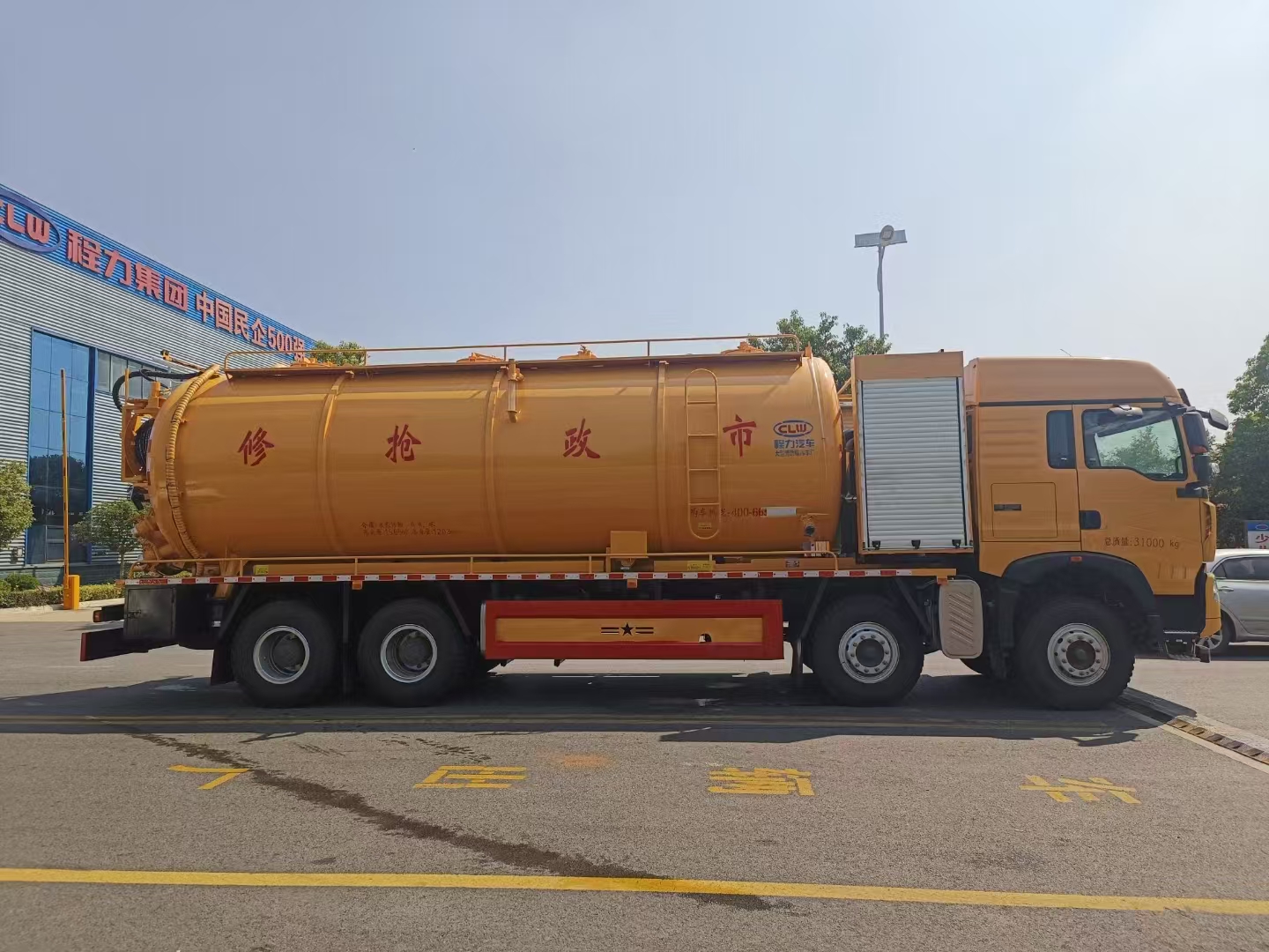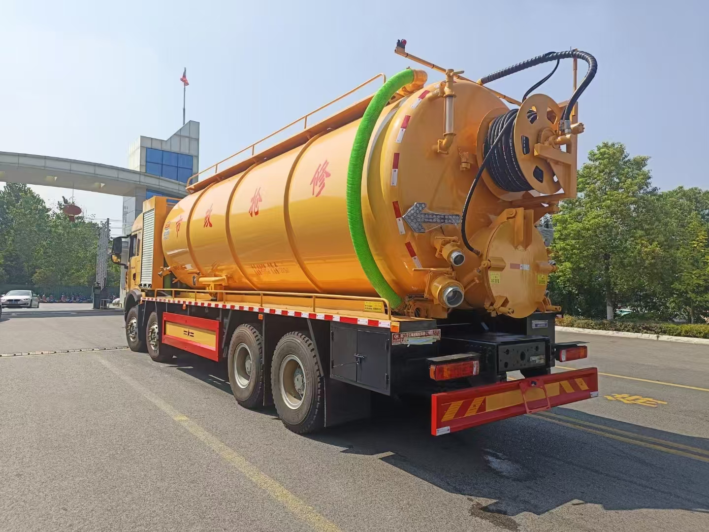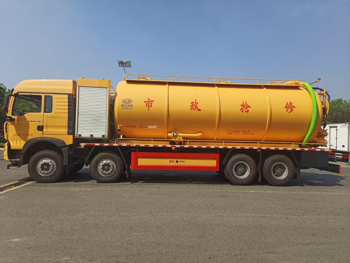 上装配置 罐体总容积约33立方,清水箱约10立方,其余为污水罐,加强大架,两仓互通,采用8mm碳钢制作,吸污部分,副发采用420马力配258水循环泵,8米吸污管,罐体两侧加宽平台加护栏,后部开一个600mm液压开启排污口,一个150排污球阀,和一个100的排污球阀,100内抽球阀,后部左右各一个箭头灯,配品浮350流量,配100米内径25定制耐磨高压管,带卷盘,卷盘液压左右旋转。