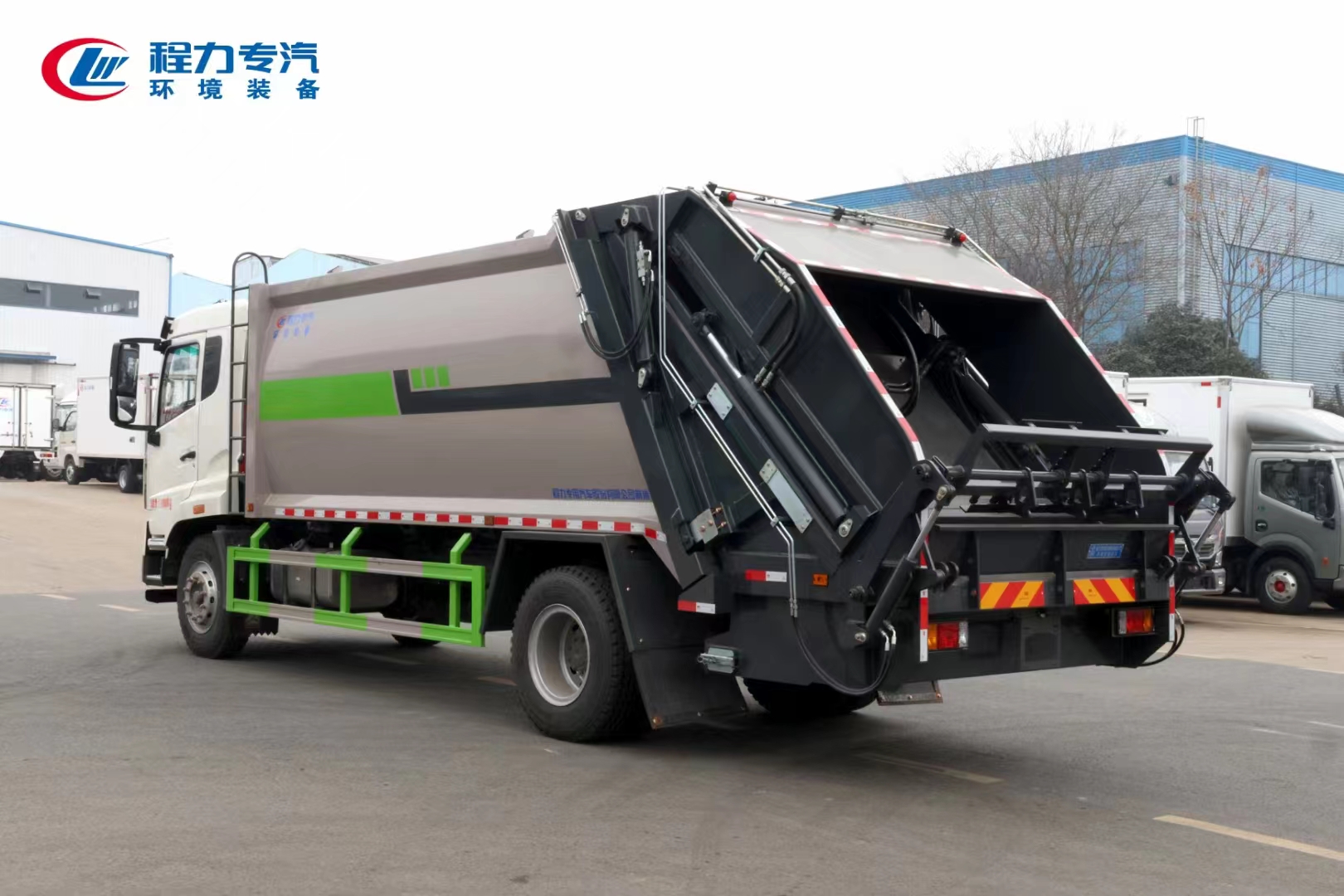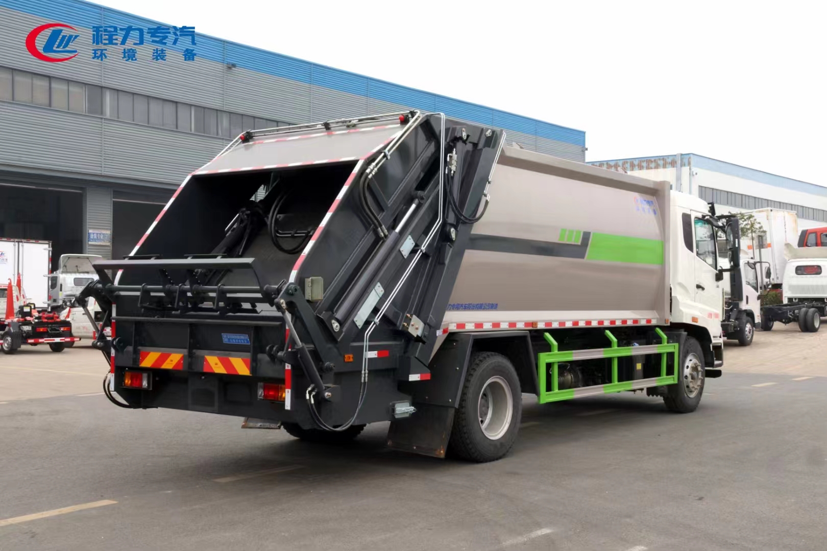 | 上装配置 | 上装为弧形箱体结构,采用Q345(局部采用T710)高强度板制作。有效容积15-18立方,采用中梅大通径五联手气一体多路阀,全系标配背压阀(增加双向压缩比),合资铁壳液压齿轮泵,嘉善取力器,中梅手气一体多路阀,恒力油缸(质保两年),加强型挂捅后翻转机构(可选装三角斗、全密封斗、摆臂等翻转机构),外置滑板缸结构设计,石墨烯尼龙滑块,长沙福力CAN总线控制系统,尾部带有硅胶控制面板,标配无线遥控,带光电感应保护装置,标配后污水箱,(中联样式双排污口),可加装侧边污水箱。加装气动密封盖。 | ||
