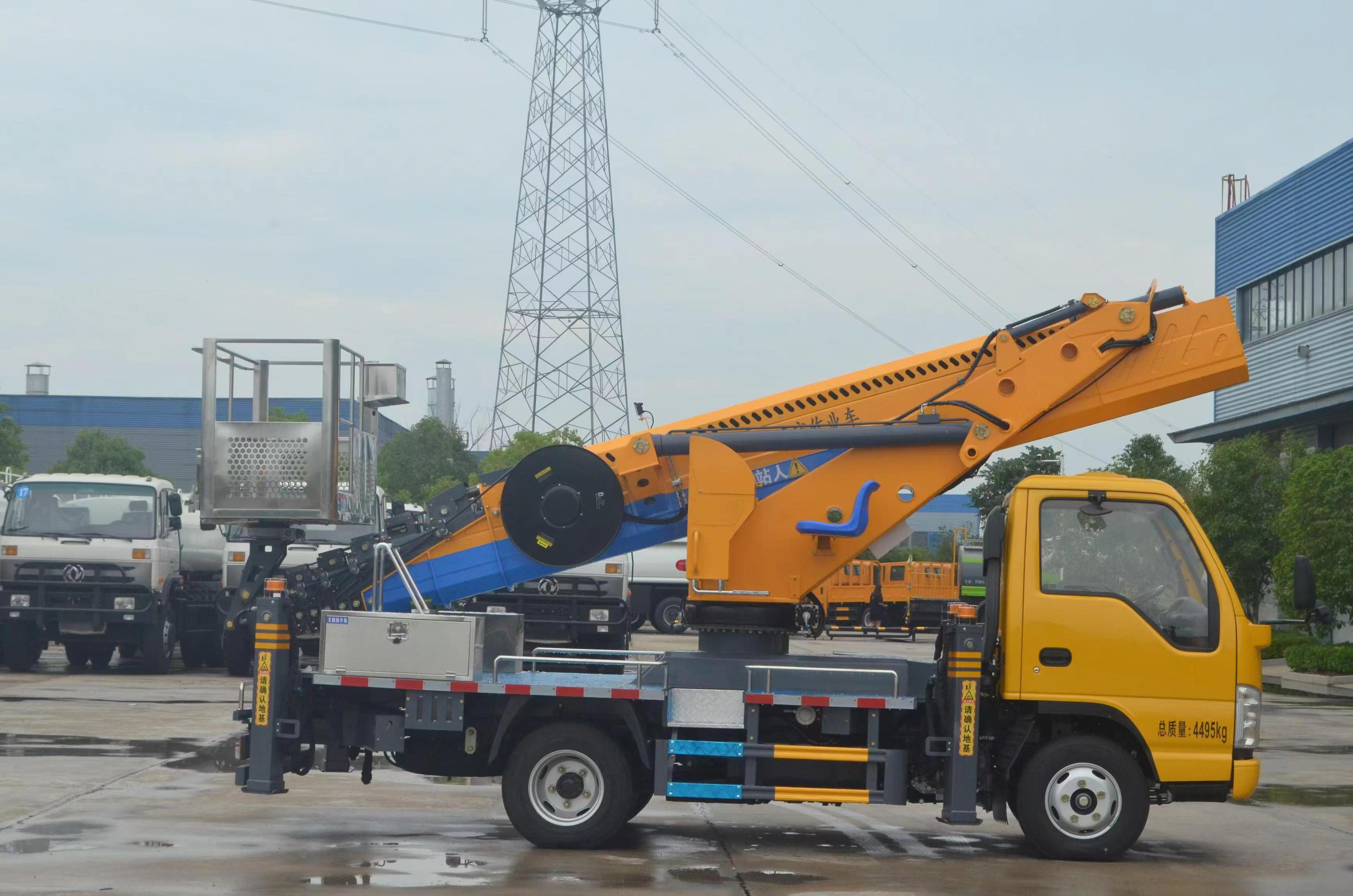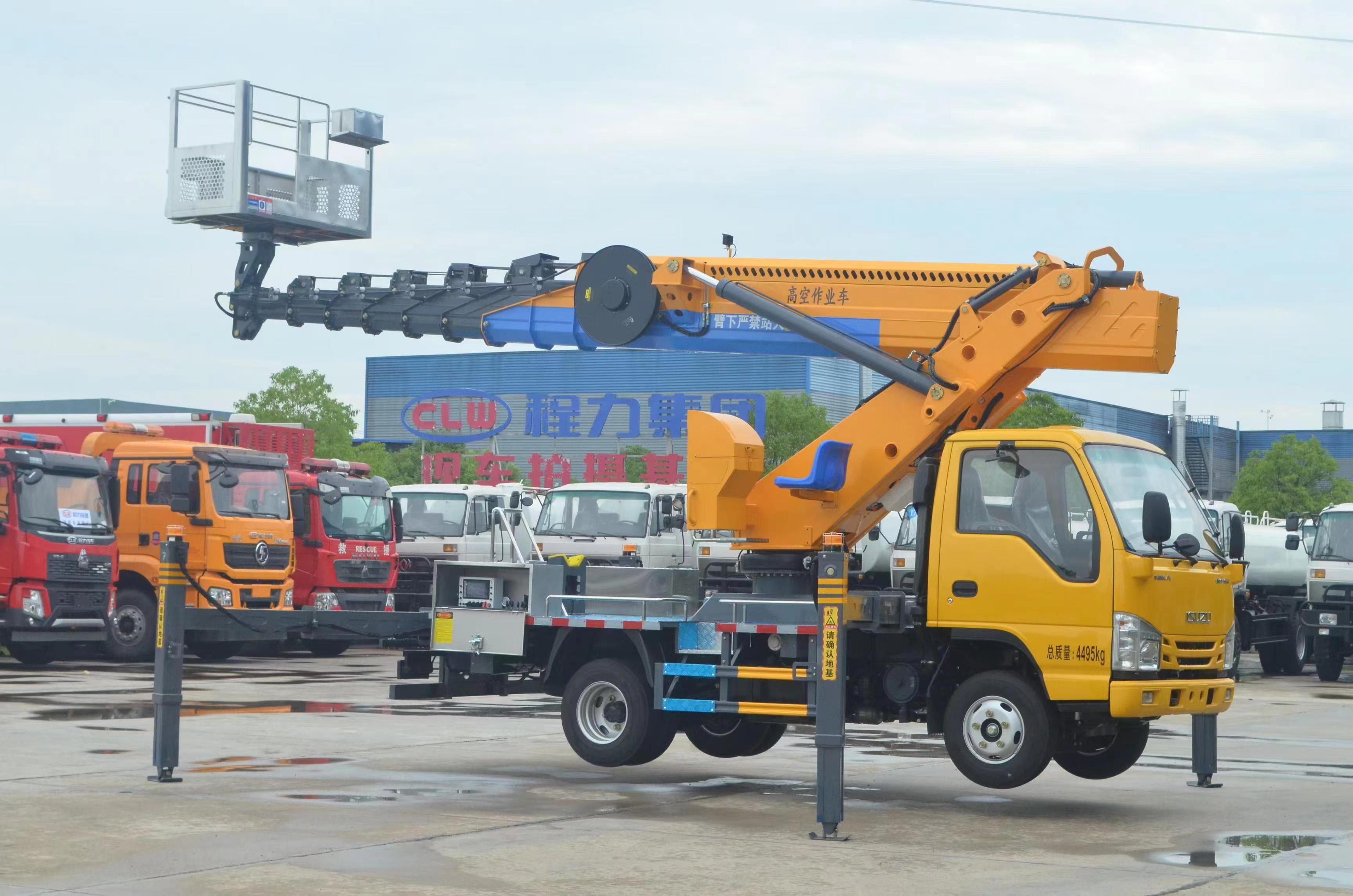 上装配置 不锈钢围栏及防滑走台板,高强度不锈钢工作平台 (尺寸:1600X700X1000mm),七节十四边形型工作臂,同步伸缩,回转装置 360 度连续回转,前 V 后 V 型支腿,单独可调(控制),电控操作,另配有手动应急操作 控制系统,CAN 总线控制系统,配有无线遥控器、实现 无级调速,静液自动调平; CL5045JGK6ADS 型高空作业车基本功能安全配置:作业车可以实现平台载荷 200KG,最大作业高度 33 米,最大作业幅度 15 米。 上下车自动互锁装置,用于上下车互锁,防止误操作发生危险,手动应急泵,当发动机及主泵发生故障时,可通过应急系统将工作人员送回到地面及整车收回至行车状态,工作平台紧急停止 装置,紧急动限制工作幅度,当工作幅度达到规定值时,自动限制危险方向工作;当出现支腿支地不实时(软腿),举升臂架将限制危险方向工作。(选配) 夜间安全警示装置,在车辆上有工程频闪灯,LED 照明灯发动机点火熄火,控制器可对发动机进行点火,熄火控制;被限制工作时,可通过“强制”功能拓展工作;